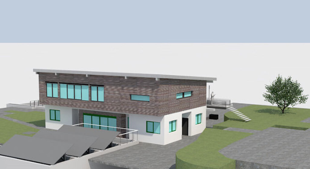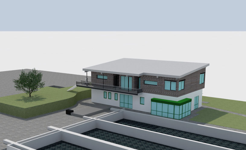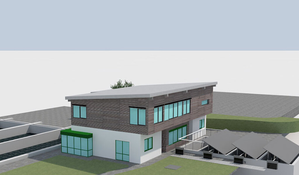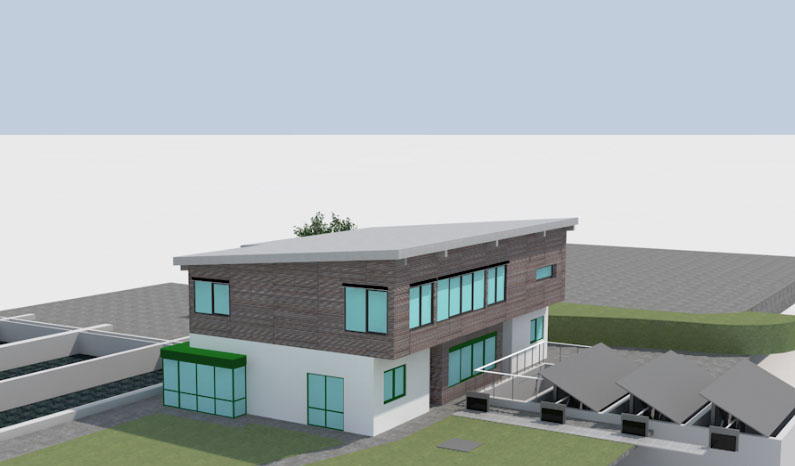 entwurf einer aufstockung auf bestehendem betriebsgebäude einer kläranlage, mit pultdach in holzständerbauweise, raumprogramm mit büroräumen, sanitär- und umkleidebereiche mit schwarz-weiss trennung, besprechungsraum mit küchenbereich, gestaltung der fassade mit vorvergrauter rhombusschalung.