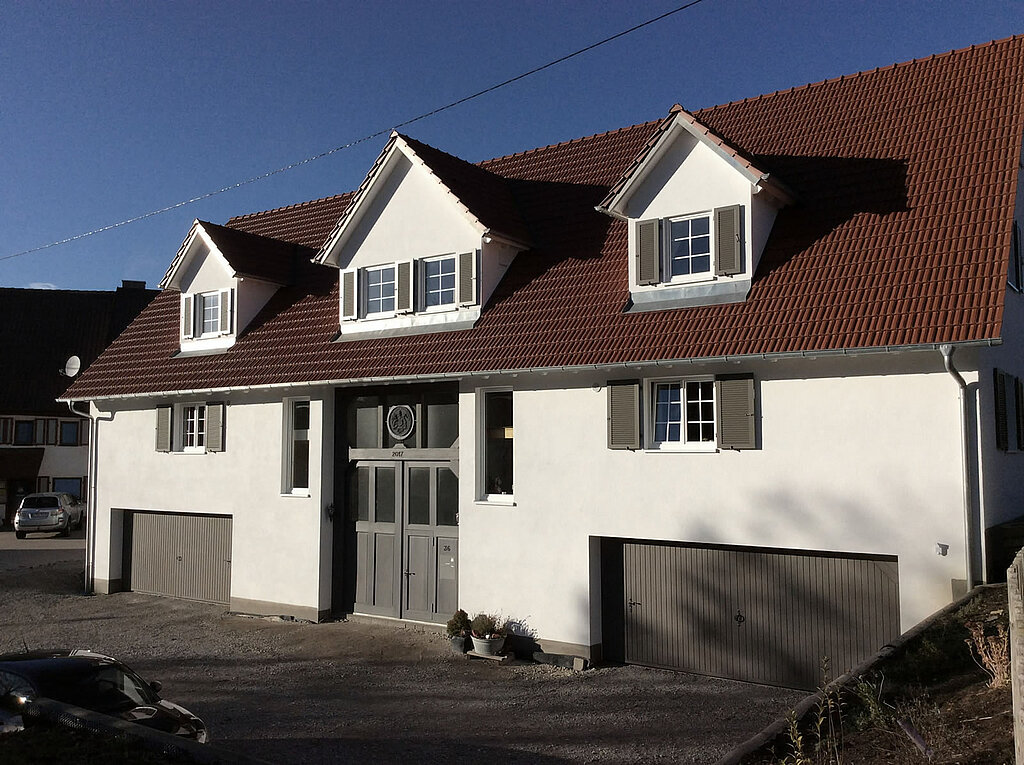 neubau eines doppelhauses für zwei familien mit fast identischen grundrissen, bauen im alten ortskern in form eines zweigeschossigen baukörpers mit untergeschossgaragen und gemeinsamem überdachtem eingangshof, steiles ortstypisches satteldach mit dachgauben zur belichtung des dachgeschosses, in massivholzbauweise, überdachte terrassen, gestaltung der fassade mit fensterläden, vollunterkellerung, mit geothermie beheizt.