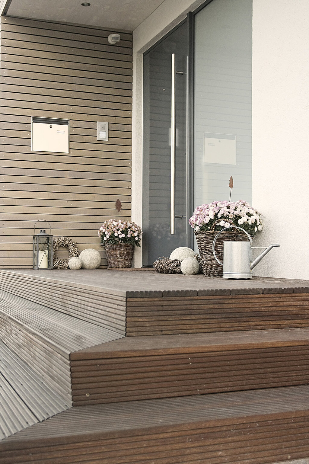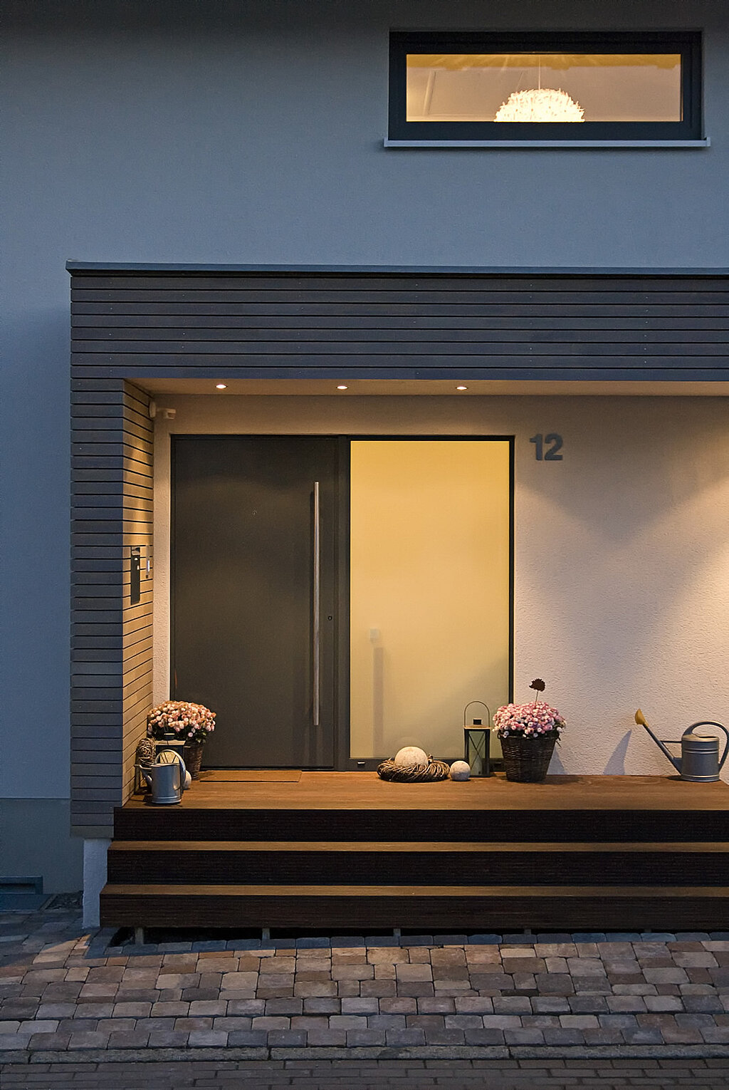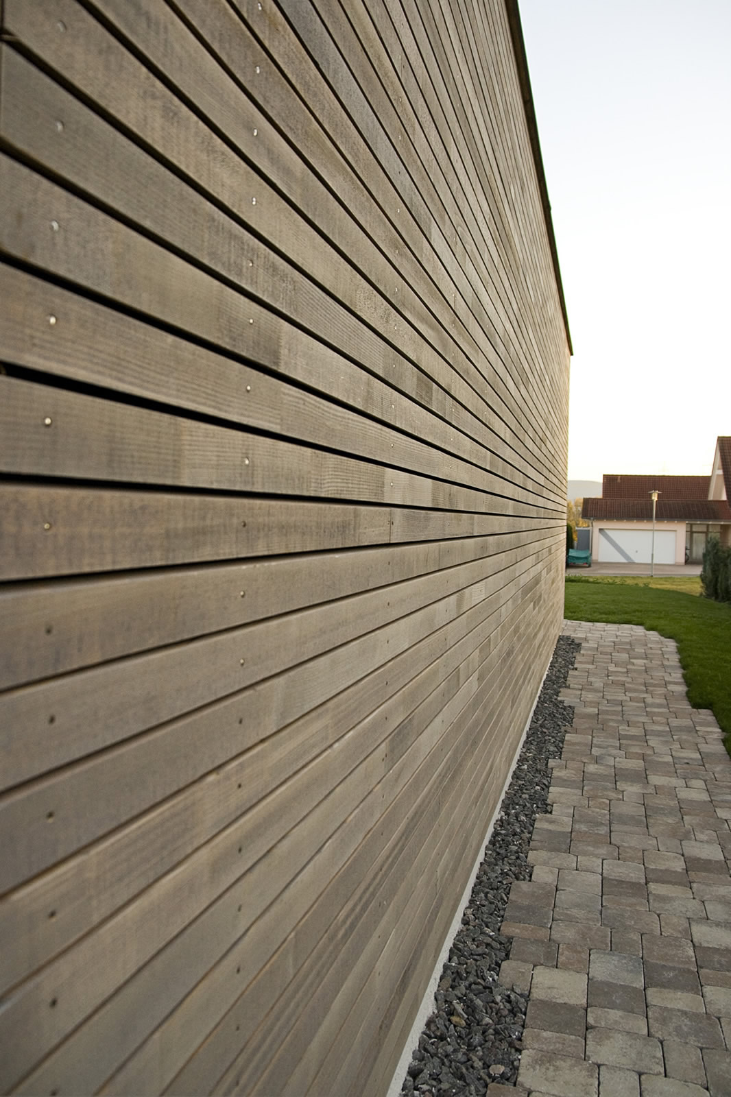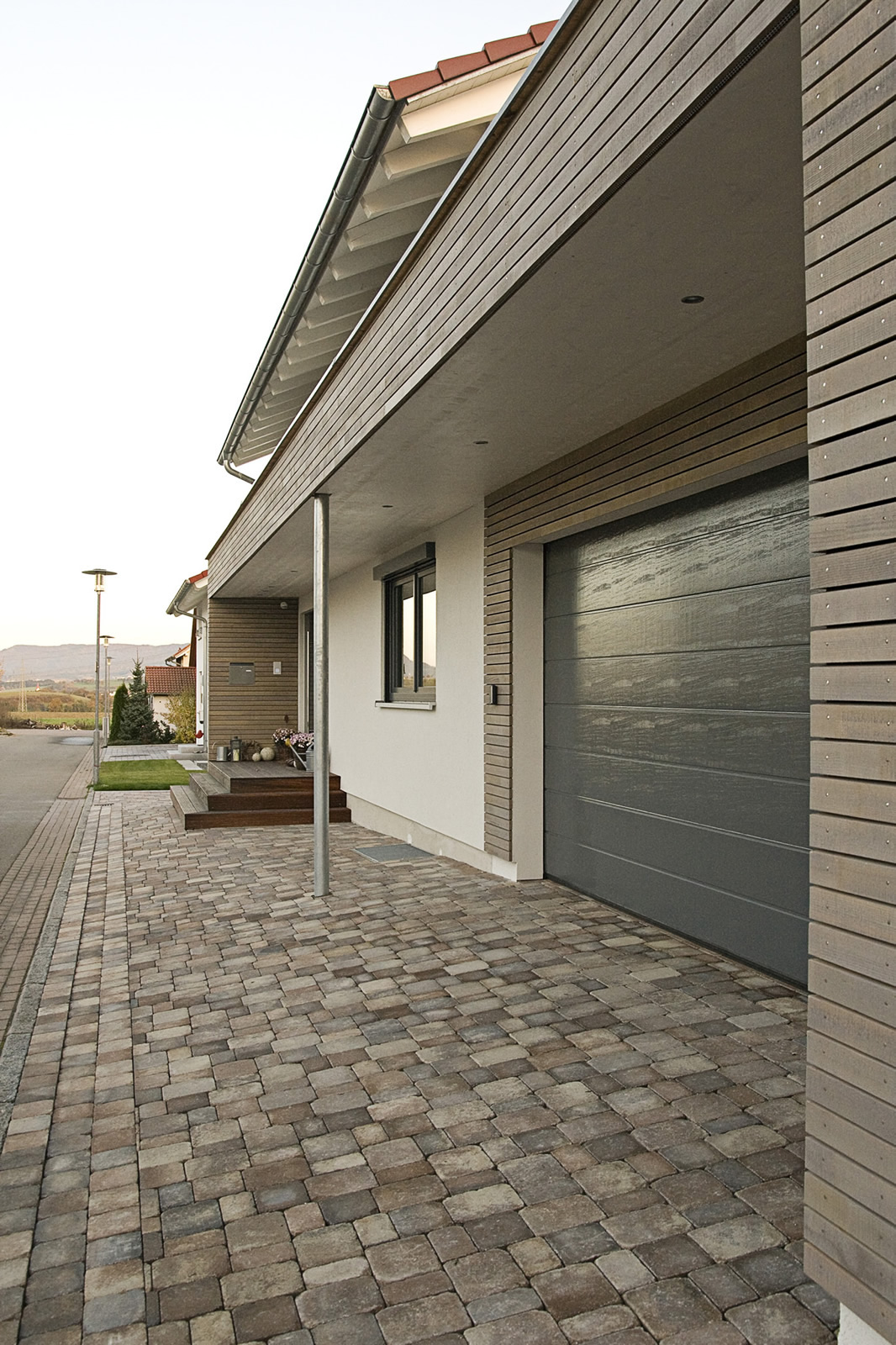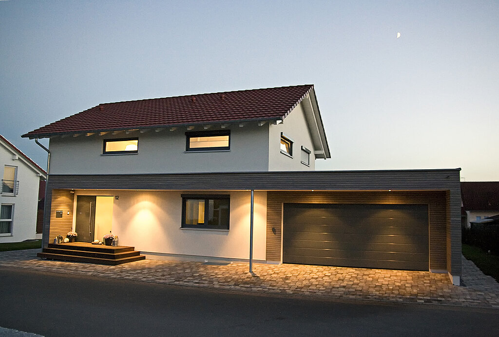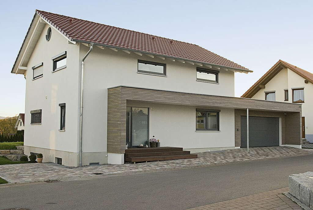 neubau für eine junge familie im neubaugebiet, zweigeschossiger baukörper mit satteldach in holzständerbauweise, wohngebäude mit grosszüger eingangsüberdachung mit verbindung zur garage, verputzte fassaden und akzente mit vorvergrauter rhombusschalung.