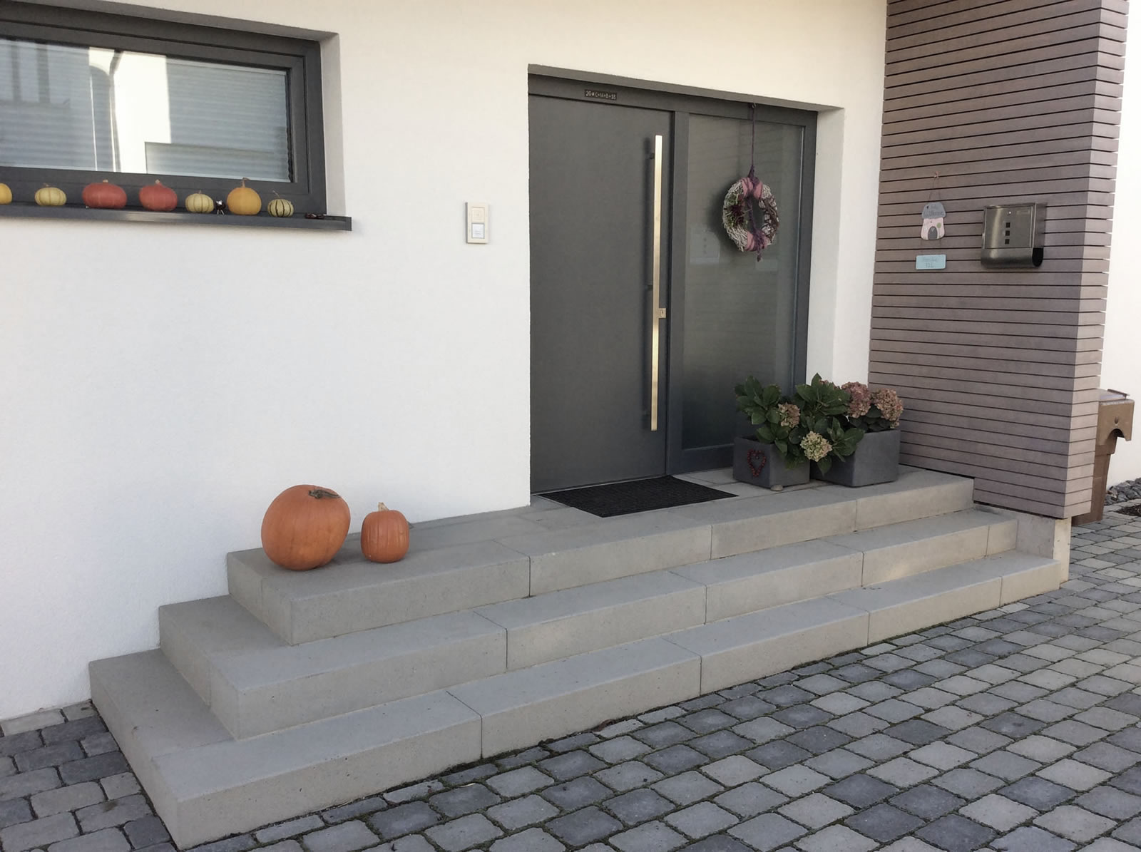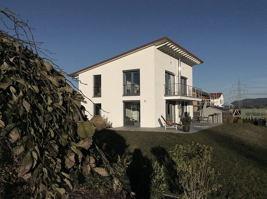 neubau eines wohnhauses für eine familie im neubaugebiet, schlanker zweigeschossiger baukörper mit pultdach in massivbauweise, zusätzlicher balkon im obergeschoss, überdachter eingang und carport mit nebengebäude für fahrräder und geräte schließt an, vollunterkellerung, mit luftwärmepumpe beheizt.