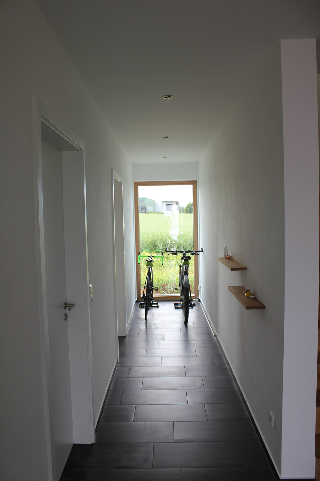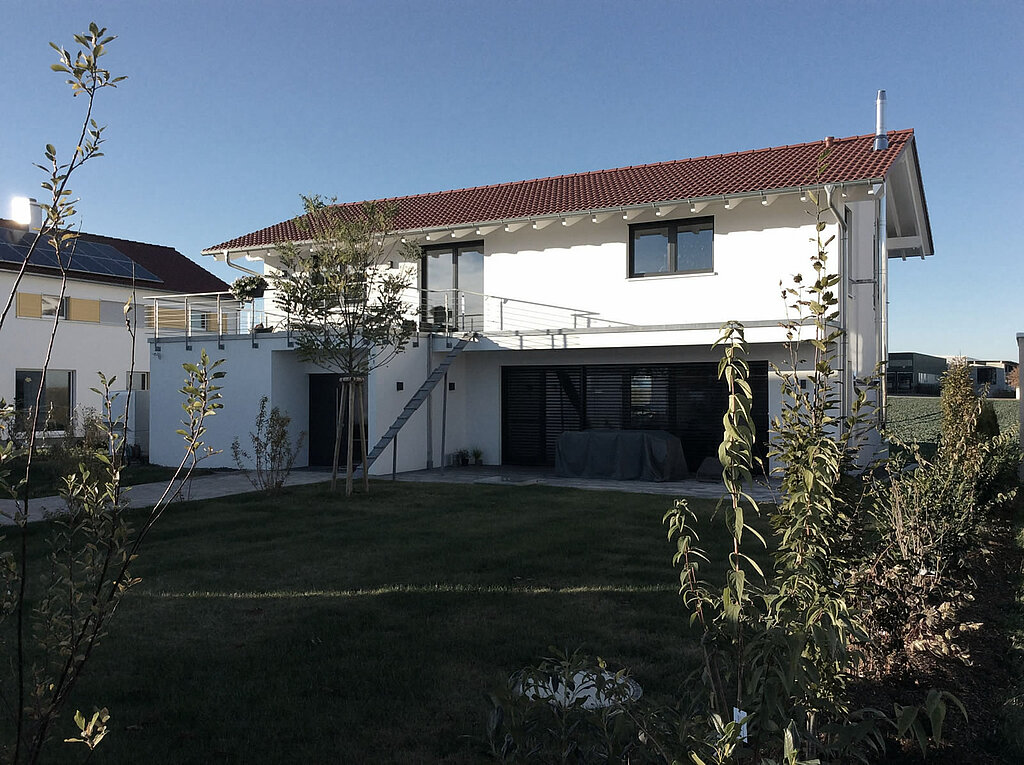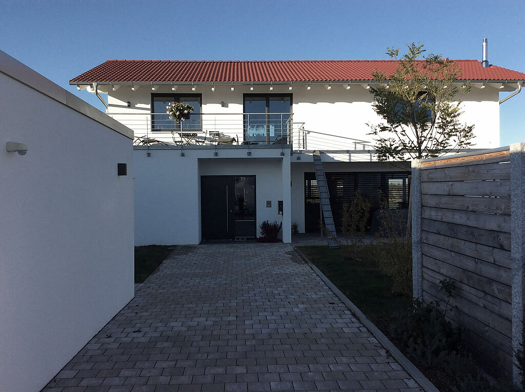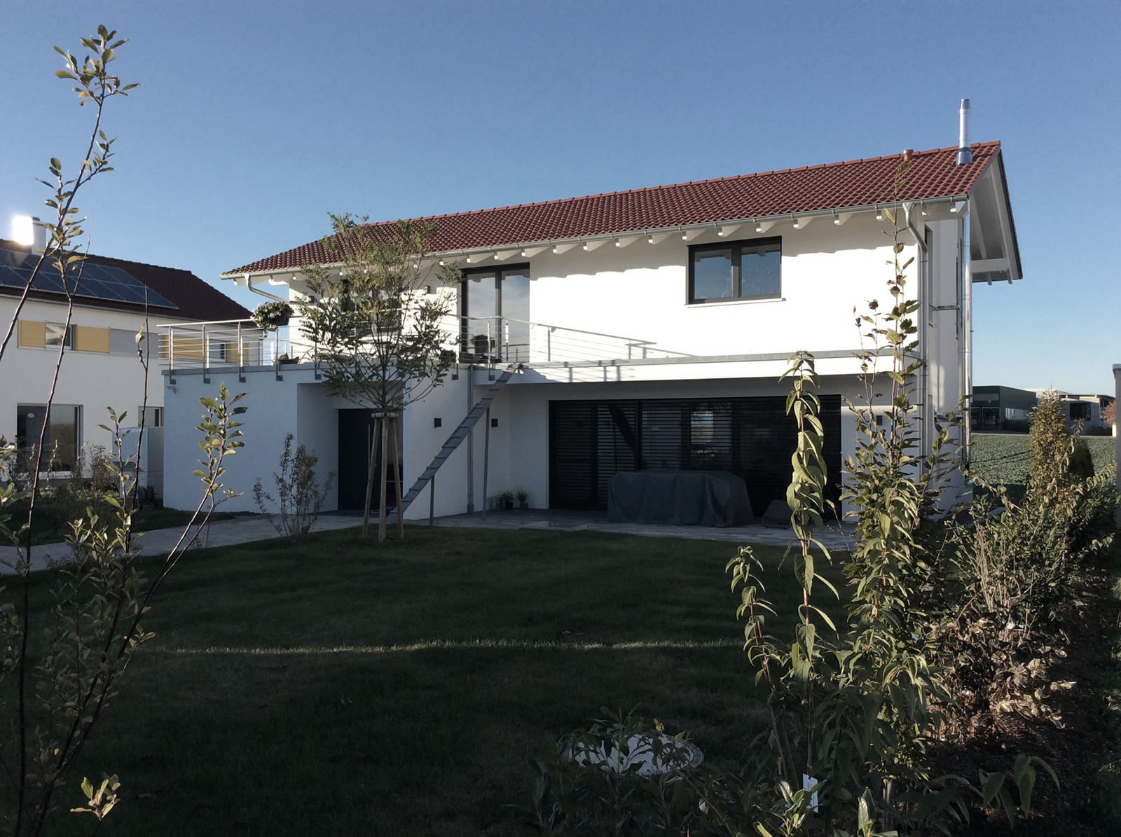 neubau eines wohnhauses für zwei personen mit haustier in einem neubaugebiet, schlanker hoher zweigeschossiger baukörper mit flach geneigtem satteldach in massivbauweise, losgelöste doppelgarage, ohne unterkellerung mit luftwärmepumpe beheizt