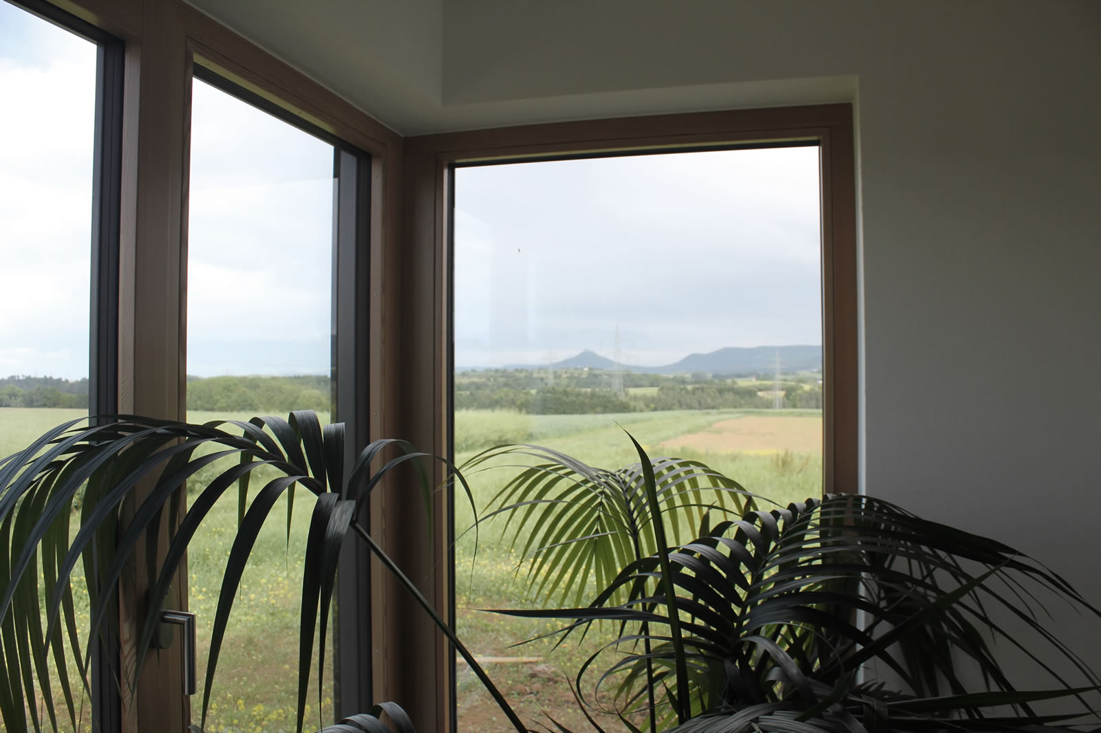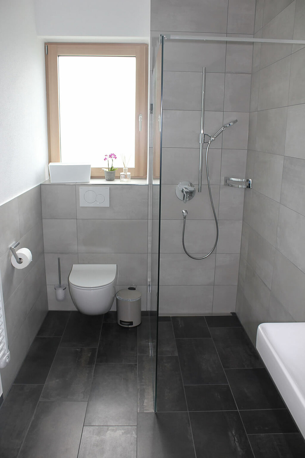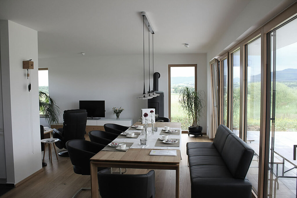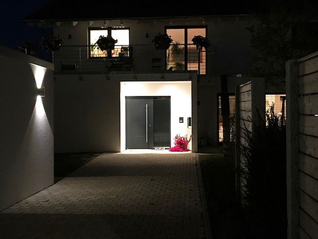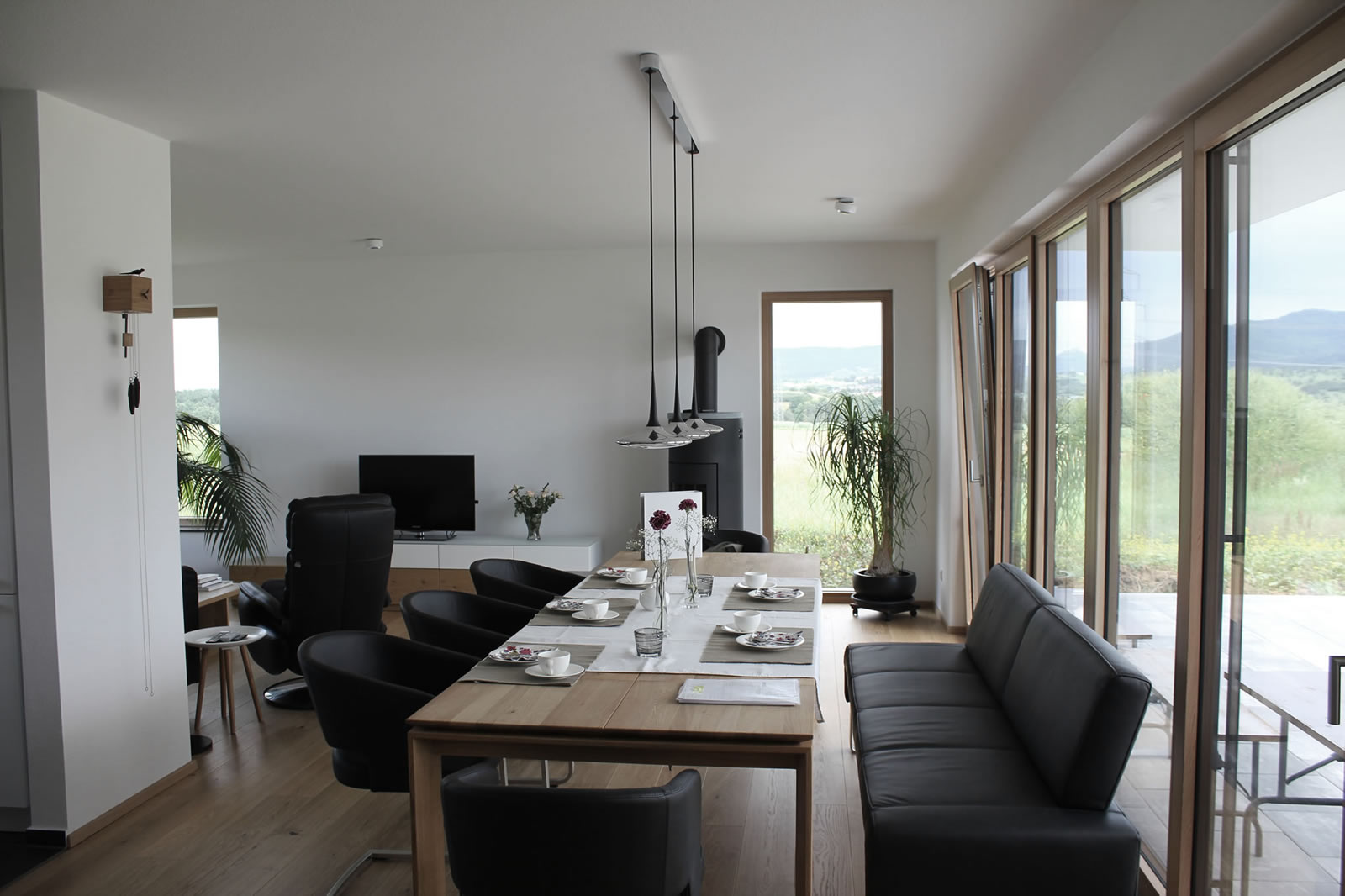 neubau eines wohnhauses für zwei personen mit haustier in einem neubaugebiet, schlanker hoher zweigeschossiger baukörper mit flach geneigtem satteldach in massivbauweise, losgelöste doppelgarage, ohne unterkellerung mit luftwärmepumpe beheizt