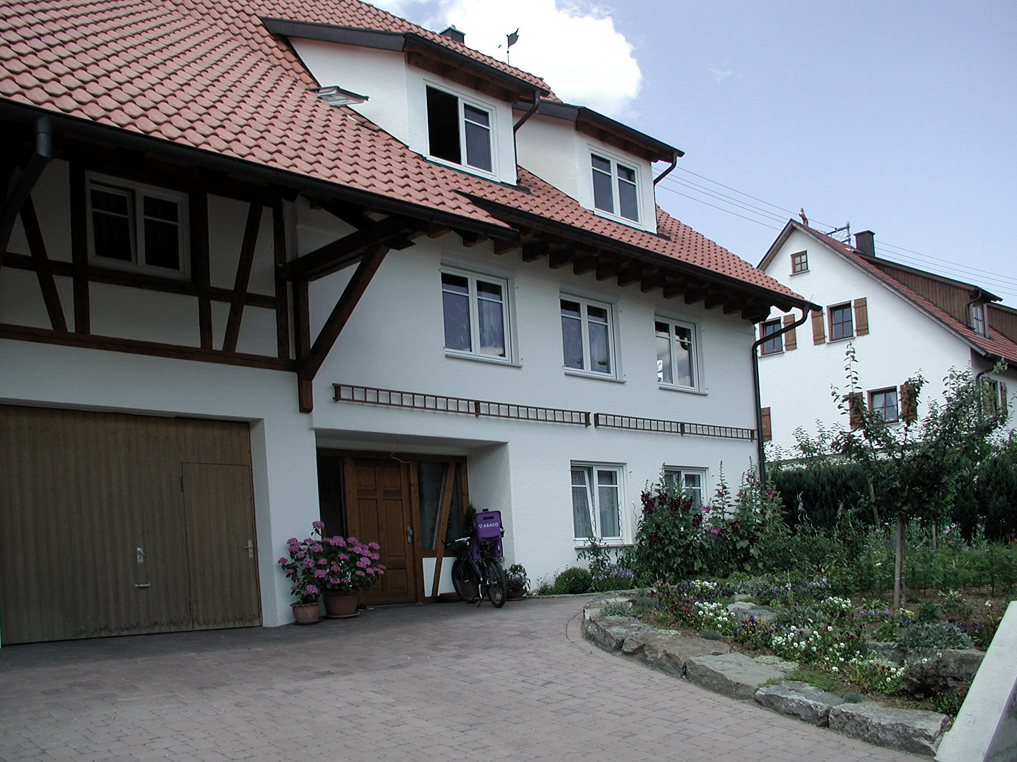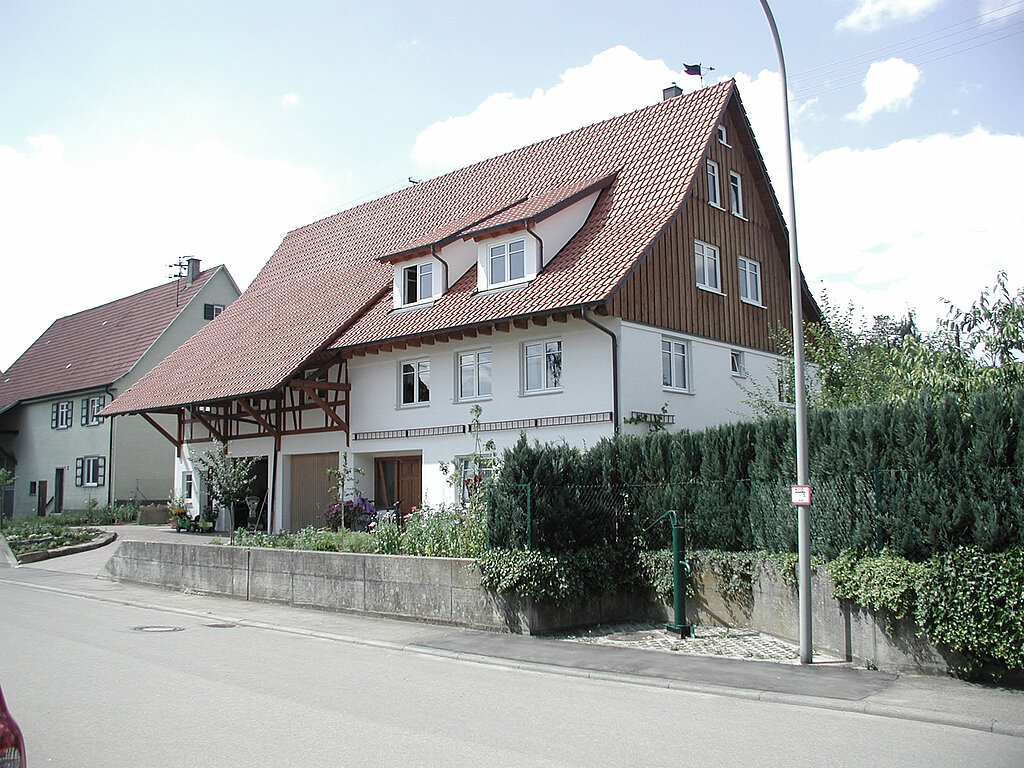 teilabbruch und wiederaufbau an einem grosszügigen ökonomiegebäude, umnutzung und ausbau der scheune im obergeschoss, überdachter laubengang mit aussentreppe in den garten, einbau neuer heizung, -sanitär und elektroinstallation. wohnen im alten ortskern mit neuem wohnkomfort, wohnen mit viel platz für eine fünfköpfige familie mit kleiner einliegerwohnung für die tante im eingangsgeschoss, großzügige raumaufteilung und bauerngarten für hobbygärtner ideal.